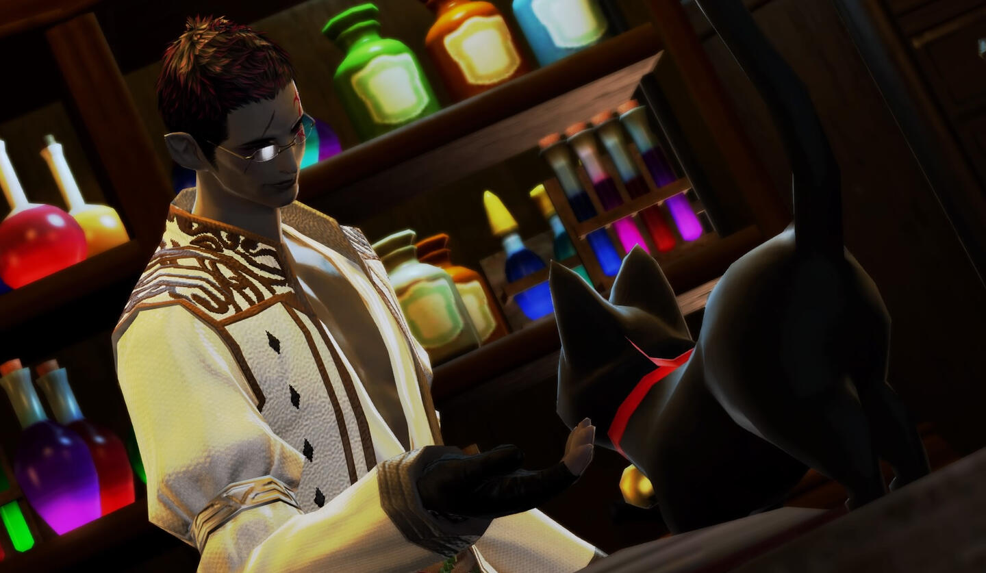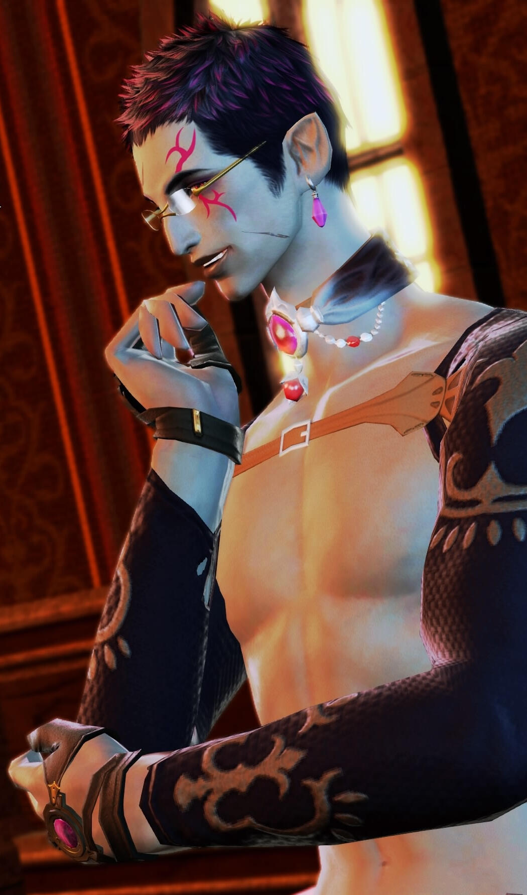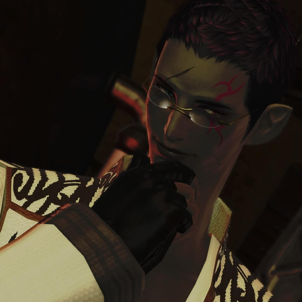 Noticeable features: spectacles, mismatched eye colors, briar-esque tattoo over left eye, scar on left jaw and over right eyebrowBased in Ul’dah, Verlain is an alchemist and potion seller by trade who hardly goes anywhere without his black coeurl kitten right at his heels. His timid demeanor is betrayed by the notable efficacy of his products, often ranging from tinctures that merely cause a tickle to potions that are potent enough to knock out a buffalo. As such, he’s a popular dealer for those looking to add a kick to their Bloodsands performances, but insists these are poor substitutes for lack of skill.He usually prefers the company of books to people, and is more than a little awkward in conversation. Nevertheless, he believes in knowing his clientele more personally to cater towards their needs, though he will trip over himself more often than not.His pursuit of knowledge often extends to anatomy, and as such, his notes may be littered with a few sketches of those who capture his interest, or willing subjects.He keeps strange hobbies, but that’s not for just anyone to know…